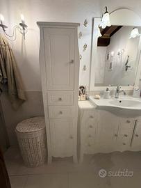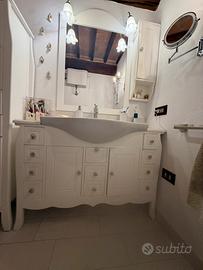 Composizione completa e in ottimo stato di mobile bagno completo di: colonna con due sportelli e due cassetti, mobile principale 11 cassetti e due sportelli, pensile con mensola e sportello e specchiera con luci comprese, come gia scritto e in ottimo stato quasi come nuovo ha solo un piccolo difetto come nella foro nel piano a destra del lavandino, lo abbiamo acquistato 2 anni fa ma lo vogliamo sostituire per cambio arredamento