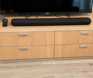 Composizione soggiorno laminato rovere chiaro L. 270. Mobile con ante, p. 40, mobile tv con 4 cassetti p. 65, due pensili con vetro temperato satinato a ribalta. Smontaggio e trasporto a carico acquirente.