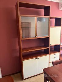 Composizione soggiorno Poliform in legno di ciliegio massello, in buone condizioni a parte qualche segno di usura. Alcune mensole sono modulabili in altezza. Il tavolo di 1 metro x 1 metro si apre raddoppiando la sua lunghezza. Corredato di 6 sedie. Profondità 50 cm nella penisola, 32 cm nel corpo centrale. Altezza 229 cm. Lunghezza 307 cm. Ho i pomelli originali, quelli che si vedono in foto sono stai messi in un secondo momento.