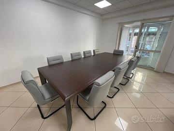 Composizione di tavoli riunioni in legno o in vetro, tondo o rettangolare o esagonale, con gambe in ferro o fianco legno e sedie su slitta o ruote.Richiedi un preventivo per il tuo ufficio.Arreda con stile la tua sala riunioni.