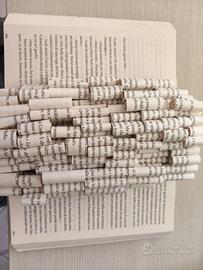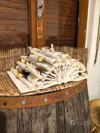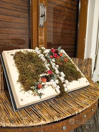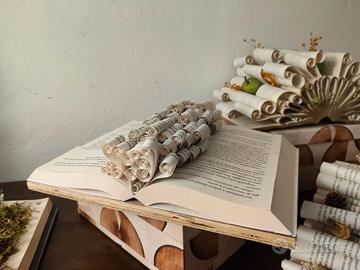 Composizioni realizzate a mano con utilizzo di libri, fiori secchi o finti.