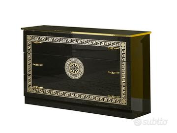 Finiture di Prestigio: la combinazione di un intenso color nero con i dettagli dorati applicati sui profili e sulle decorazioni frontali offre un contrasto caldo e lussuoso, tipico dell’arredamento di alta classe.