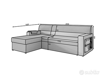 Misure: lunghezza 250 cm – altezza 85 cm – profondità 160 cm – dimensione letto 125×210 cm