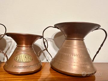 Vendo tre conche antiche in rame maetellato con manici . Altezze a scalare : 12 cm , 11 cm , 9 cm milto particolari , su di una vi e il marchio di fabbrica in ottone ‘ Fiuggi ‘