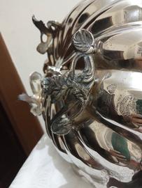 Conchiglia porta confetti e cioccolatini di Sheffield con cucchiaio e tre piedini a rilievo e una lavorazione lucida e brunita e piccole imperfezioni evidenziate da foto per renderlo anticato, nuova fine serie!!