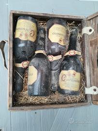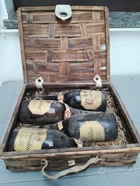 Vendo confezione originale di 4 bottiglie di caramino anno 1974,la confezione è in legno intrecciato con chiusure e manico in puro cavallino.