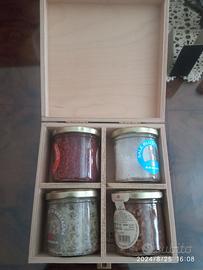 Confezione Sali dal mondo Brezzo per degustazione, composta da Tritasale in acciaio e scatola in legno con 4 vasetti in vetro contenti 4 tipi di sale:
