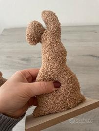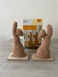 Set di due conigli decorativi per Pasqua. Realizzati in tessuto effetto peluche su base in legno. Altezza circa 23 cm ciascuno. Come nuovi