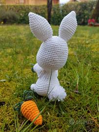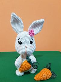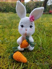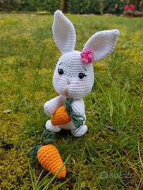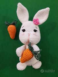 Coniglietto pasquale pensato come decorazione per la casa e realizzato ad uncinetto in 100% cotone (codina in acrilico), tra le mani regge stretta a sé una piccola carotina. Altezza 16cm comprese le orecchie. È inclusa una piccola e semplice confezione regalo ma non la carotina decorativa in più. Non valuto offerte o sconti, il prezzo è fisso.