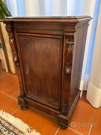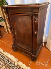 Comodino in legno intagliato con top in marmo primi novecento. Dimensioni: 75x46x32. Chiusura a scatto non originale. Ritiro in loco.