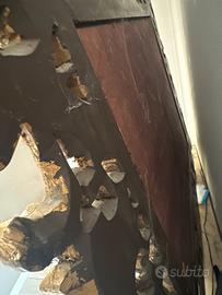 Vendo consolle antica con specchiera in stile barocco, originale d’epoca (fine ‘800 / primi ‘900, stima). Mobile di grande impatto scenografico, riccamente intagliato e dorato, con piano in marmo naturale sagomato originale e specchio coevo.