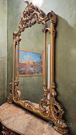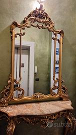 Elegante specchiera con console in stile Rococò (o Barocco veneziano), caratterizzata da un design estremamente decorativo. La Specchiera (Cimasa e Cornice) Presenta le tipiche linee curve e asimmetriche del Rococò. La parte superiore è dominata da una cimasa traforata molto elaborata, con motivi a volute, riccioli e foglie d'acanto. Materiale e Finitura: legno intagliatocon una finitura in foglia d'oro (o doratura a mecca) che presenta una bella patina antica, con zone più scure che ne esaltano il rilievo. Struttura: La cornice presenta delle aperture laterali che creano un gioco di "pieni e vuoti", rendendo la struttura visivamente più leggera nonostante le dimensioni importanti. La Console Piano: La base su cui poggia lo specchio è un piano in marmo pregiato, probabilmente un marmo Breccia o un marmo di Verona, caratterizzato da venature calde che vanno dal crema al marrone rosato. Il bordo del marmo è sagomato a "becco di civetta" per seguire la linea curva del mobile. Base: la base della console riprende i motivi dorati della specchiera, con gambe mosse e intagliati che si integrano perfettamente con la parte superiore.