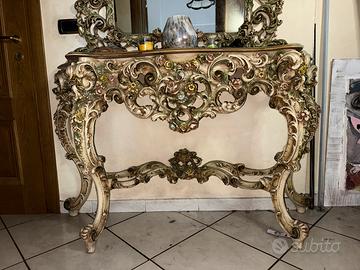 Vendo raffinata console barocca veneziana componibile con ampia specchiera coordinata, finemente lavorata a mano. Struttura scenografica in legno intagliato, decorato con motivi floreali policromi in rilievo e finitura patinata oro antico. Ideale per ingressi, salotti eleganti, ambienti classici o arredamenti teatrali.