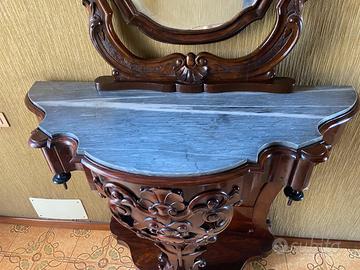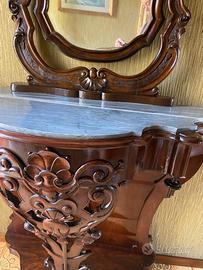 Vendo elegante console d’epoca completa di specchiera, realizzata in legno massello finemente intagliato a mano, con piano in marmo grigio.