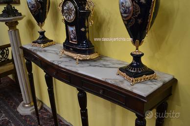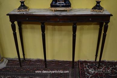 Elegante console italiana in mogano con piano in marmo degli anni 50 Mid-Century, caratterizzata da un raffinato design con un fronte leggermente curvato, provvisto di cassetto centrale e due finti cassetti ai lati con piano in marmo , sostenuta da sei gambe affusolate e tornite, che le conferiscono un aspetto slanciato e piedini in bronzo.