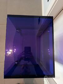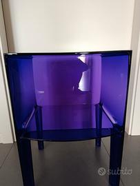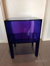 Vendo consolle Small Ghost Buster di Kartell, disegnata da Philippe Starck in collaborazione con Eugeni Quitllet. Questo pezzo di design è la versione comodino o "night-table" del più grande comò Ghost Buster. Si presenta come un piccolo cubo quadrato sorretto da quattro gambe, realizzato interamente in PMMA(materiale plastico). La sua struttura gioca con riflessi e prospettive grazie all'alternanza di spigoli e linee curve. Caratteristiche Principali Designer:Philippe Starck con Eugeni Quitllet. Materiale:PMMA trasparente o colorato in massa (mostrato qui nella variante viola). Dimensioni:Circa 40 cm di larghezza, 37 cm di profondità e 57 cm di altezza. Versatilità:Grazie alla resistenza del materiale, può essere utilizzato sia in interni che in esterni come comodino, tavolino d'appoggio o elemento contenitore. Pezzo usato ma tenuto molto bene, è stato rivestito dopo l'acquisto con la pellicola trasparente protettiva sulla parte superiore e all' interno per evitare che i ripiani venissero graffiati, volendo l'acquirente può sempre rimuovere le protezioni scaldando con un phon.