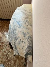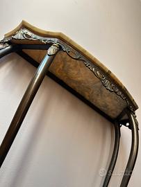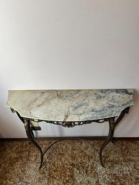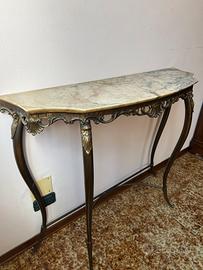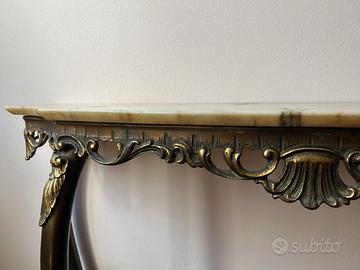 Console da ingresso con piano in marmo originale e struttura in ottone lavorato. (parte lunga 101x31.5cm) Design elegante in stile classico/vintage, ideale per ingresso, corridoio o salotto. Il piano in marmo presenta belle venature naturali, mentre la struttura in ottone dona un aspetto raffinato e di pregio. Condizioni generali buone, stabile e pronta all’uso. Ritiro a mano. Disponibile anche tavolino coordinato (vedi altri annunci)