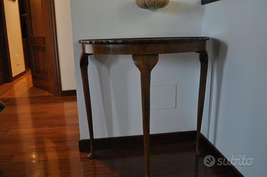 CONSOLLE a mezza luna in legno di mogano con gambe di linea mossa; cm. 73 x 38 x alt. 76. XX secolo.
