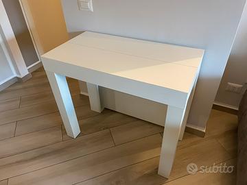 Consolle allungabile color bianco…larga 90 cm profonda 48,5 alta 76,5 con 4 ripiani da inserire per un totale di 3m di lunghezza massima…ogni ripiano misura 63 cm x 86 cm …facilmente nascondibili nella parte posteriore della consolle. Qualche sbeccatura del legno facilmente sistemabile.