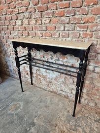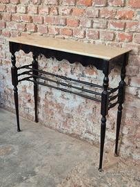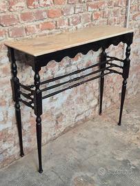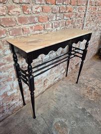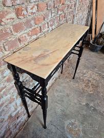 Elegantissima consolle anni ’50 con struttura in legno nero e piano di marmo rosa. Presenta una linea snella e slanciata che la rende leggera e perfetta per essere collocata in un ingresso, uno studio o in camera da letto. Le dimensioni sono contenute: cm 93x30 h. cm 85. Le condizioni generali sono buone: piccoli segni di usura e pellicola sul piano di marmo da rimuovere, come da foto. Ritiro a carico dell’Acquirente a Milano zona Bicocca.