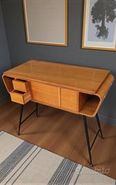 Consolle anni ’60 vintage designer Gio Ponte per Singer ,esempio emblematico del dialogo tra design industriale e arredamento domestico del periodo. Leggera ed elegante, forme morbide, funzionalità e cura del dettaglio. La struttura in legno laccato presenta profili arrotondati, mentre le gambe in ferro verniciato nero, sottili ma robuste, slanciano la figura del mobile e sono completate da piedini in ottone, che aggiungono un tocco di pregio e luminosità. Il piano superiore apribile rivela il vano per la macchina da cucire Singer, trasformando un elettrodomestico in un elemento d’arredo discreto e raffinato. Cassetti con apertura a pressione e scomparti integrati mantengono la linea pulita tipica del design Mid-Century. Oggi può essere usata come mobile da ingresso, scrittoio, consolle decorativa o pezzo statement in interni contemporanei o retrò. Le proporzioni equilibrate e il mix di materiali le conferiscono un forte impatto visivo, portando negli spazi il fascino del design italiano anni ’60. Dimensioni: – Larghezza: 100 cm – Profondità: 42 cm – Altezza (piano chiuso): 80 cm