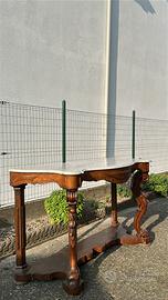 Vendo consolle antica in legno massello con piano in marmo bianco sagomato. Stile elegante, gambe lavorate, ideale per arredare ingressi o soggiorni. Misure: 167x58x95 Condizioni: buone, con qualche segno del tempo. Marmo integro.