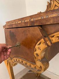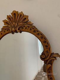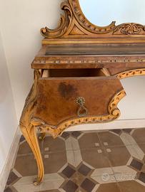 Bellissima consolle antica in legno con specchiera in ottimo stato. La specchiera è molto scenografica, con una forma sagomata e sinuosa. La cornice è riccamente intagliata con motivi floreali e volute, culminando in una decorazione a ventaglio nella parte superiore. Il piano crea un bel contrasto con il legno chiaro intagliato. Sotto il piano ci sono due ampi cassetti con maniglie ad anello in metallo. Le gambe sottili e slanciate conferiscono leggerezza ed eleganza all’insieme. Si elencano le misure. Altezza fino al piano 80 cm. Altezza compreso specchio 117 cm. Larghezza piano nero 122 cm. Profondità del piano 46 cm. Larghezza totale delle gambe del mobile 141 cm. Misure dei due cassetti: 27 cm larghezza totale, 23.5 cm parte utile per inserire oggetti 38 cm profondo, 34 cm parte utile Prezzo leggermente trattabile. E' preferibile il ritiro di persona a Lecce perché è difficile spedire vista la sua grandezza.