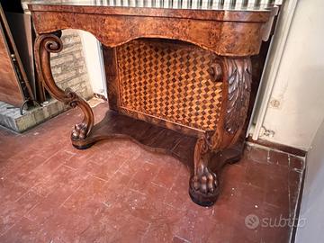 Elegante consolle antica in stile impero, realizzata in radica di noce