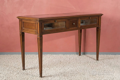Consolle bacheca in legno massello con piano superiore dotato di due vani vetrati e cassetti frontali, ideale per esporre oggetti, collezioni o piccoli accessori mantenendoli protetti. La struttura slanciata con gambe affusolate e cornici classiche dona eleganza al mobile, rendendolo perfetto per ingresso, soggiorno o studio. I vani a vetrina permettono di valorizzare il contenuto, mentre il cassetto centrale offre ulteriore spazio contenitivo, unendo funzionalità ed estetica in un arredo di gusto tradizionale.