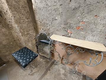 consolle con piano in marmo, struttura in ferro battuto con riccioli barocchi, completa di sgabello con cuscino a teschio. il piano in marmo ho una seccatura come da foto.