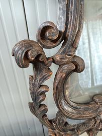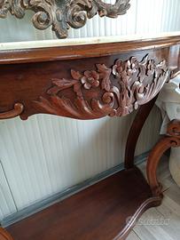 Consolle primi novecento con piano in marmo di pregio e cassetto, totalmente restaurata , abbinata a specchiera in legno massello con perfili argentati.