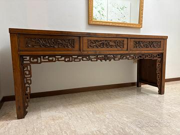 Bellissima consolle olmo intagliato, antiquariato cinese, antichità epoca xx secolo zona Zhejiang, Cina. arte orientale
