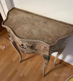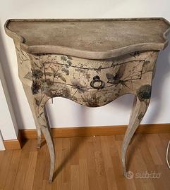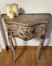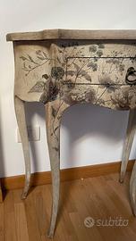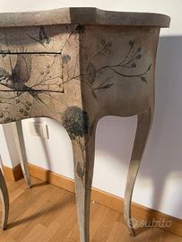 Delicato tavolino in legno decorato con motivi floreali, perfetto per creare un angolo romantico e senza tempo. Le sue linee morbide e lo stile vintage raccontano una storia fatta di quiete e bellezza. Un cassetto discreto e una superficie ideale per candele o piccoli oggetti del cuore.