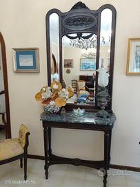 Specchiera: Struttura a tre sezioni con cimasa lavorata, ideale per dare profondità e prestigio a un ingresso o un salone.