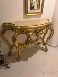 Vendo consolle classica da ingresso, struttura in legno intagliato e dorato, con piano in marmo/pietra chiara sagomato, stile barocco / Luigi XV.