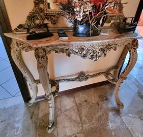• Consolle monumentale: Struttura riccamente intagliata con finitura avorio e oro. Il pezzo forte è il piano in pregiato marmo rosa, perfettamente integro, senza macchie, crepe o sbeccature.