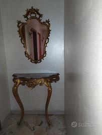 Antica consolle in oro con ripiano in marmo, con specchiera stile vecchio barocco, usata in buone condizioni, prezzo affare trattabile.