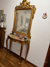 consolle con specchiera antica in legno oro stile barocco. misura consolle: lunghezza 90, larghezza 38, altezza 85 misura specchio: lunghezza 1,22- larghezza 94 misura totale: 220 x80