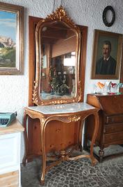 Consolle ( h 105 cm, piano 88x53 cm, lastra di marmo rilucidata) con specchio a mercurio ( cornice intagliata 142x76 cm, spessore 5 cm) metà XIX provenienza Italia in noce, dorata a bolo, restaurata.