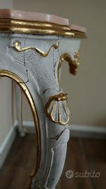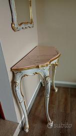 Consolle stile veneziano in spesso legno intagliato, marmo rosa rilucidato con specchio abbinato, completamente restaurata e dorata a foglia oro, rifinita con cere antichizzanti.