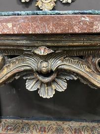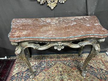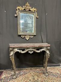Per un arredo assolutamente esclusivo per chi cerca l’alta epoca e la raffinatezza la consolle misura 135x60 alta 90 e ha come piano un eccezionale marmo di spessore 4,5cm la specchiera invece misura 90x130