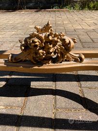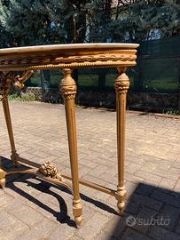Consolle d’epoca, legno con finitura dorata. Piano in marmo chiaro con venature rame. Le misure sono 108x39 x h86 cm