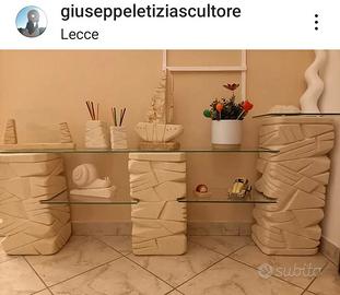 Consolle da ingresso in pietra leccese con mensole in vetro da 0,5 cm