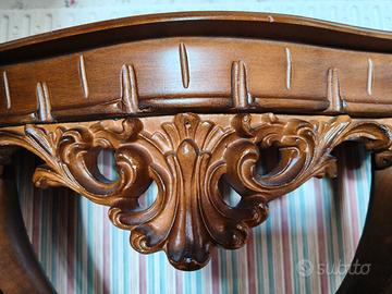Vendo raffinata consolle sospesa da parete in legno, caratterizzata da ricchi intagli artigianali e una forma a mezzaluna classica. Il design elegante la rende perfetta per arredare un ingresso, un corridoio o come punto d'appoggio sotto uno specchio importante.