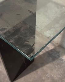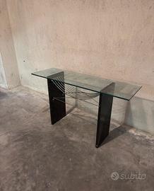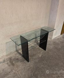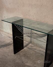 Splendida consolle di design postmoderno risalente agli anni '80/'90, caratterizzata da un raffinato contrasto tra materiali naturali e strutture industriali. Un pezzo d'arredo architettonico ideale per ingressi, zone living o uffici di rappresentanza. Dettagli e Materiali: Base: Due imponenti montanti verticali in pregiato marmo Nero Marquina, con le caratteristiche venature bianche naturali. Struttura: Sistema decorativo e strutturale di tiranti in acciaio cromato a raggiera, che conferisce leggerezza visiva e stabilità. Top: Piano rettangolare in cristallo temperato trasparente a spessore generoso. Il mobile si presenta in ottime condizioni strutturali. Il marmo è integro e lucido, la cromatura dei tiranti è ben conservata. Nota per la trasparenza: Il piano in vetro presenta una piccola sbeccatura su uno degli angoli (come visibile in foto di dettaglio), difetto che non ne pregiudica l'utilizzo ma di cui si è tenuto conto nel prezzo di vendita. dimensioni L 130 P 40