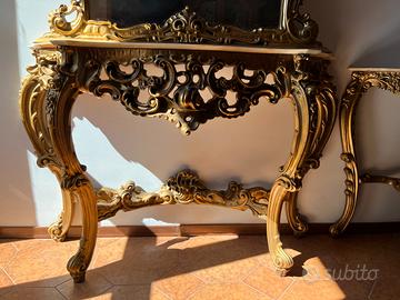 Antica consolle di ingresso dorata con specchio e pianale in marmo. Scrivere a radari2@libero.it o telefonare al 3428012716.