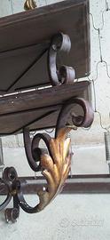 consolle da parete in legno massello e ferro battuto, corredata da applique in ferro battuto dorato a tre luci misure consolle larghezza 51 profondità 27 altezza 40 misure applique altezza 63 larghezza 50