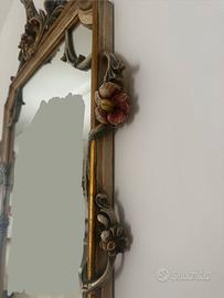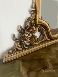 Design barocco italiano, tipico dei primi decenni del Novecento. Presenta elementi classici come volute, riccioli e motivi floreali intagliati. Realizzato in legno massello intagliato e dorato. La consolle è sormontata da un raffinato piano in marmo. Grande specchio( coperto solo per privacy ma perfetto nelle condizioni) coordinato con cornice lavorata a mano che riprende i motivi della base.