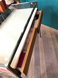 Consolle pezzo unico realizzato per esposizione. Struttura in ferro con inserti in legno di recupero e piano in vetro temprato. Misure su richiesta.