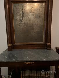 Consolle con gli inserti dorati e scolpiti, segue lo stile Impero (1820 circa). Il marmo è bardiglio nuvolato e le parti dorate dovrebbero essere in legno scopito e dorato e non in bronzo. Lo specchio (al mercurio) è originale dell’epoca e molto fascinoso nella sua patina data dal tempo trascorso.